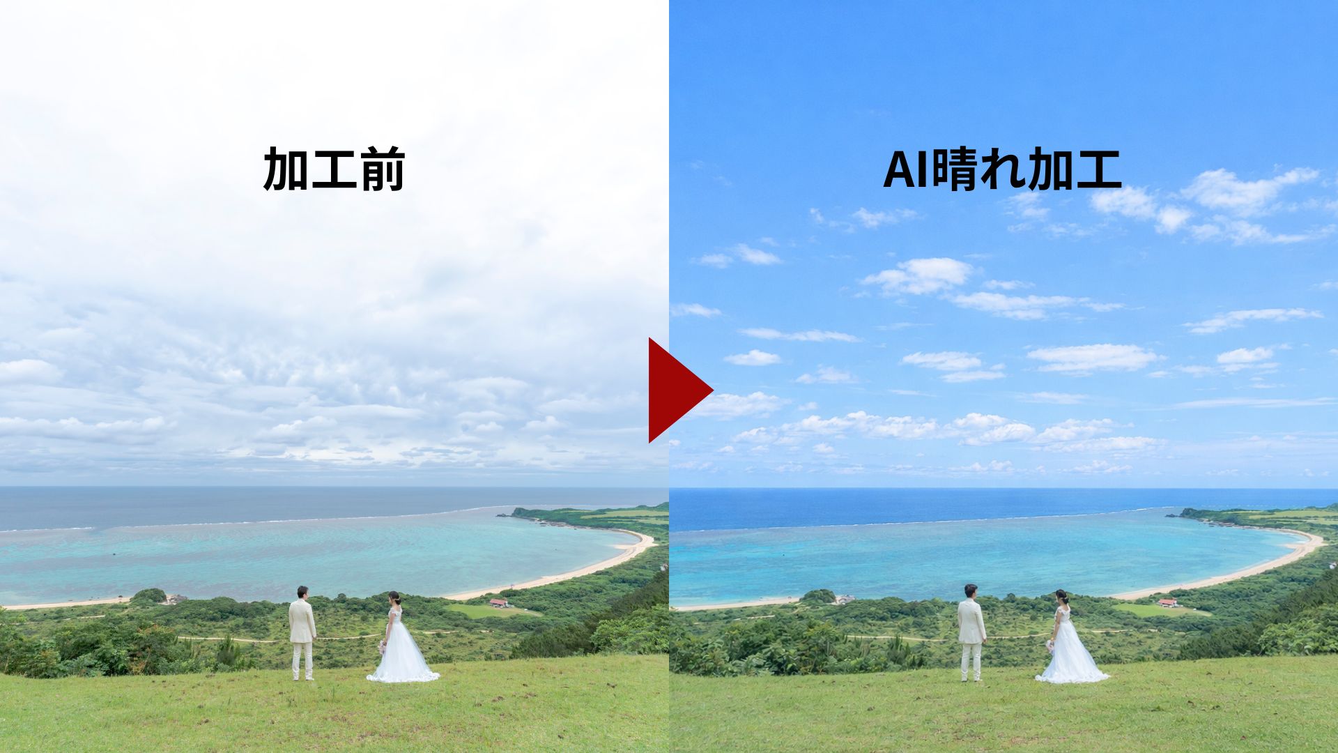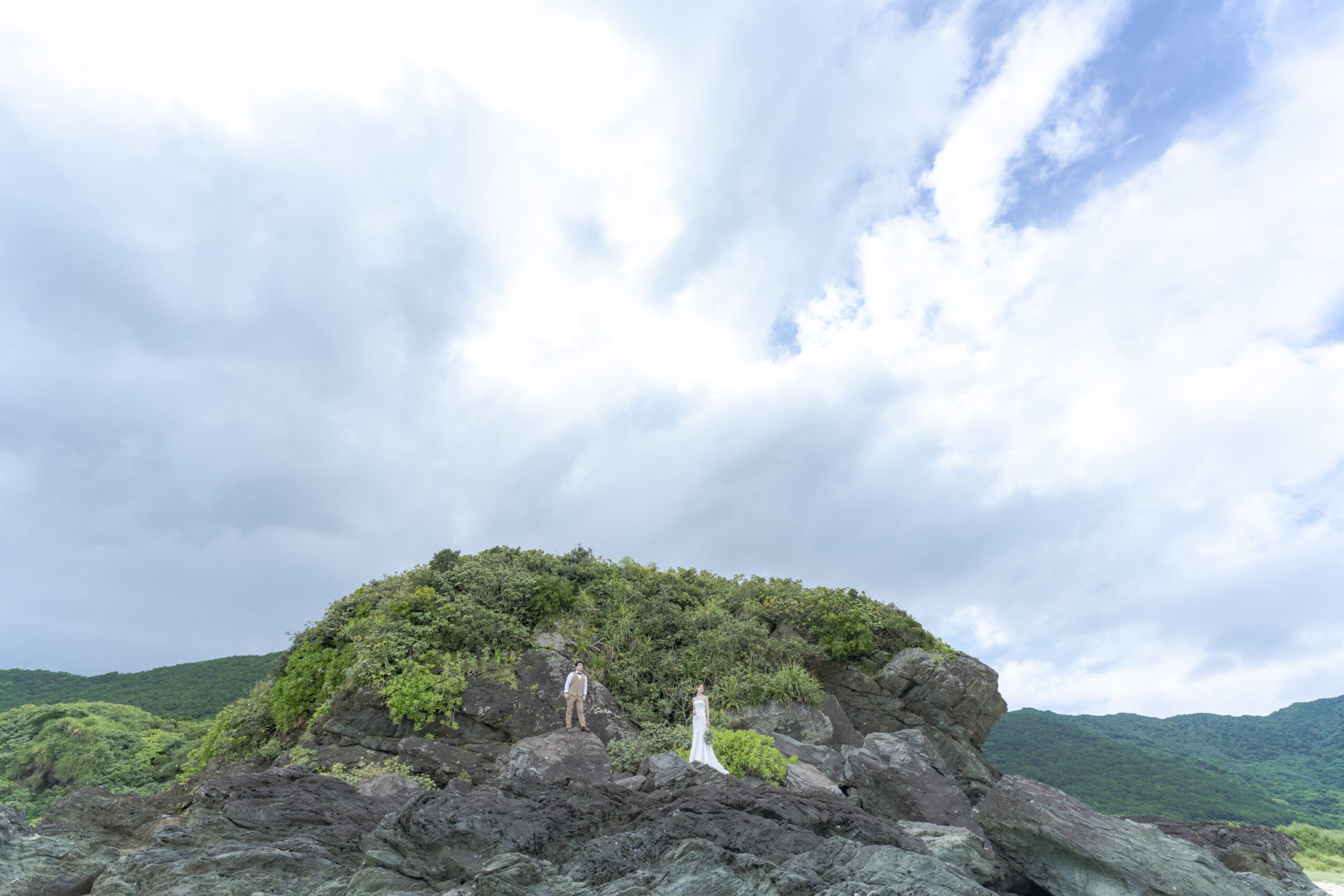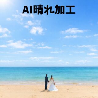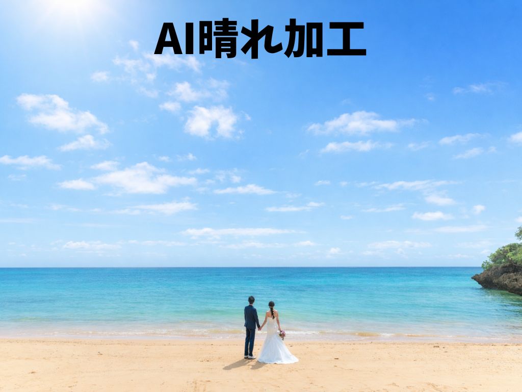 離島の天気予報はまず当たりません。その日の風向きや湿度などから天候を予測して撮影を行います。無料の雨天保障として、AI晴れ保障・延期も無料付帯しています。
