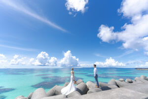 含まれているもの:撮影費用/データ納品/全カット納品/ドレス1着/着付け/タキシード1着/新婦ヘアメイク/ブーケ等小物類一式/ヘアメイクアテンド/メイキングムービー/スタッフの宿泊費用と船代/離島での移動費