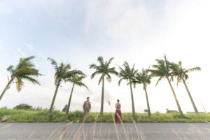 ロケ地:ビーチ+ヤシの木並木+一本道+サンセット